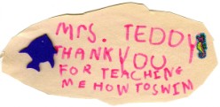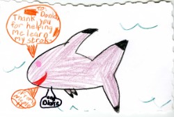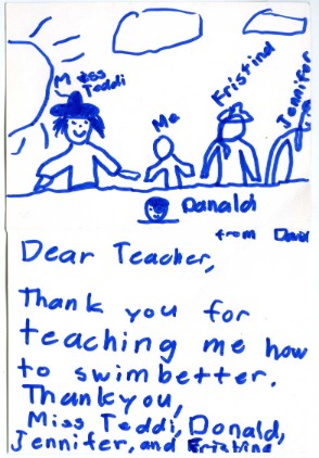Thank you for teaching me swimming lessons. I really liked it! I liked when I jumped off the diving board. One of my favorite things was getting the rings under water. You are all very good teachers. I can’t wait to come back next summer.